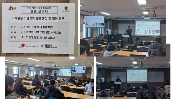 지역선도연구소 초청강연(24.11.22) - Prof.소재필 관련링크 목록 본문 지역선도연구소 초청강연(24.11.22) - Prof.소재필 1.세미나일자: 2024. 11. 22.(S1-1동 336호)2.연사자: Prof.소재필3.소속: 숭실대학교 4.주제: 고체물질 기반 양자광원 생성 및 제어 연구 목록